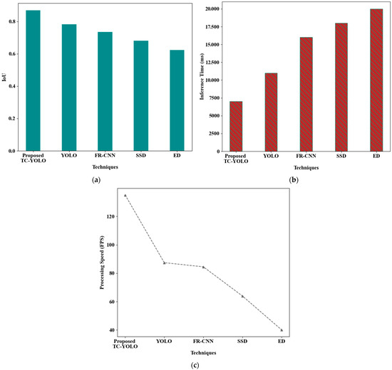 The TC-YOLO’s efficiency in detecting objects like emergency vehicles, pedestrians, and other non-motorized road users for traffic flow analysis and intensity estimation is exhibited in Figure 3a–c. To detect small objects, the proposed framework uses the TCA mechanism with YOLO, achieving higher intersection over union (IoU) (0.8693), lower inference time (7009 ms), and higher processing speed (135.0814 Frames Per Second (FPSs)). Yet, traditional approaches struggle to detect small objects in images or video frames in crowded scenes, leading to a weaker object detection performance. Therefore, TC-YOLO accurately detects objects by using the TCA approach, thereby paving the way for efficient traffic flow analysis and intensity estimation.