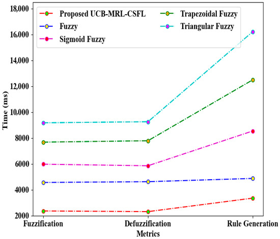 In Figure 4, the proposed framework’s performance is analyzed with regard to fuzzification, defuzzification, and rule generation times. As per the figure, the UCB-MRL-CSFL takes minimum fuzzification, defuzzification, and rule generation times of 2371ms, 2319ms, and 3361ms, correspondingly. This is because of the utilization of UBC and CS membership functions, which help with effective TSO by balancing exploration and exploitation of the learning process and modeling the complex, multimodal, or non-linear relationships between input variables. Therefore, the UCB-MRL-CSFL outperforms the other conventional methodologies.