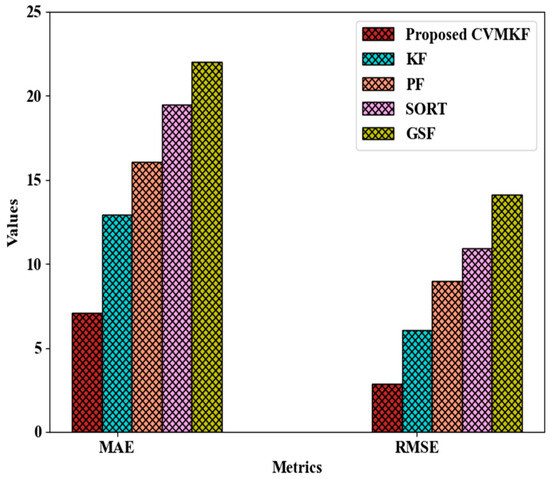 Here, the CVMKF’s efficacy in object counting for each lane is validated with several prevailing techniques like KF, Particle Filter (PF), Simple Online and Real-time Tracking (SORT), and Gaussian Sum Filter (GSF). The performance of the proposed CVMKF is validated with regard to metrics like RMSE and MAE. MAE measures the average magnitude of errors between predicted and actual values. In general, RMSE measures the square root of the average squared differences between actual and predicted values. The corresponding formulas of the metrics, namely RMSE and MAE, are shown in Table 3.