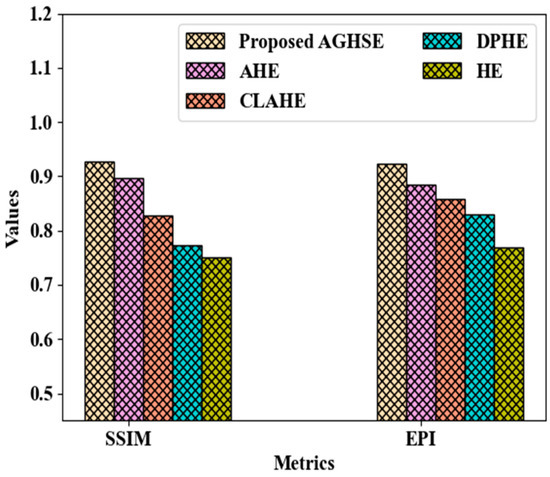In Figure 7, AGHSE’s effectiveness in contrast enhancement is depicted. Here, the proposed framework incorporates GSLCM with AHE, enhancing the image quality without hiding important information. Yet conventional AHE, CLAHE, DPHE, and HE attain lower Structural Similarity Index Measurements (SSIMs) of 0.8972, 0.8269, 0.7722, and 0.7511, and Edge Preservation Indexes (EPIs) of 0.884, 0.8592, 0.8289, and 0.7798, correspondingly, leading to reduced image quality. Therefore, compared to other prevailing techniques, AGHSE performs better with SSIMs and EPIs of 0.9273 and 0.924, respectively.