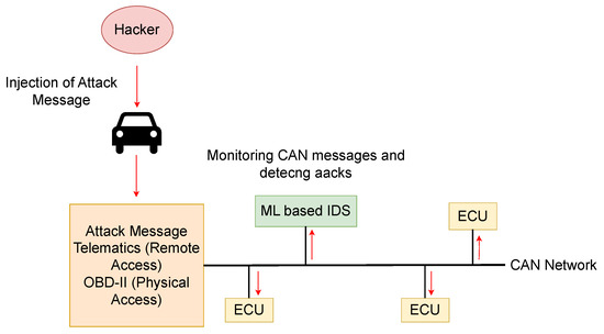 The CAN bus remains the de facto in-vehicle communication backbone, yet it was never designed with security considerations. Indeed, CAN is “inherently insecure”, lacking any form of authentication, authorization, or encryption [10,11]. Consequently, attackers can readily inject fabricated CAN frames. Empirical studies have demonstrated that such malicious injections may override legitimate Electronic Control Unit (ECU) commands—manipulating braking, steering, and other safety-critical functions—without triggering detection. Furthermore, modern vehicles may incorporate hundreds of ECUs, thereby expanding the CAN attack surface; adversaries can exploit this by altering message timing or payloads to induce vehicle malfunctions. Remote exploitation vectors have also been identified: compromised telematics or infotainment systems can serve as entry points for CAN-based attacks, highlighting the necessity of an in-vehicle intrusion detection system (IDS) to supplement network security [12]. In summary, the absence of intrinsic security mechanisms in CAN—specifically, message authentication and encryption—renders automotive networks vulnerable to injection, replay, denial-of-service, and spoofing attacks.