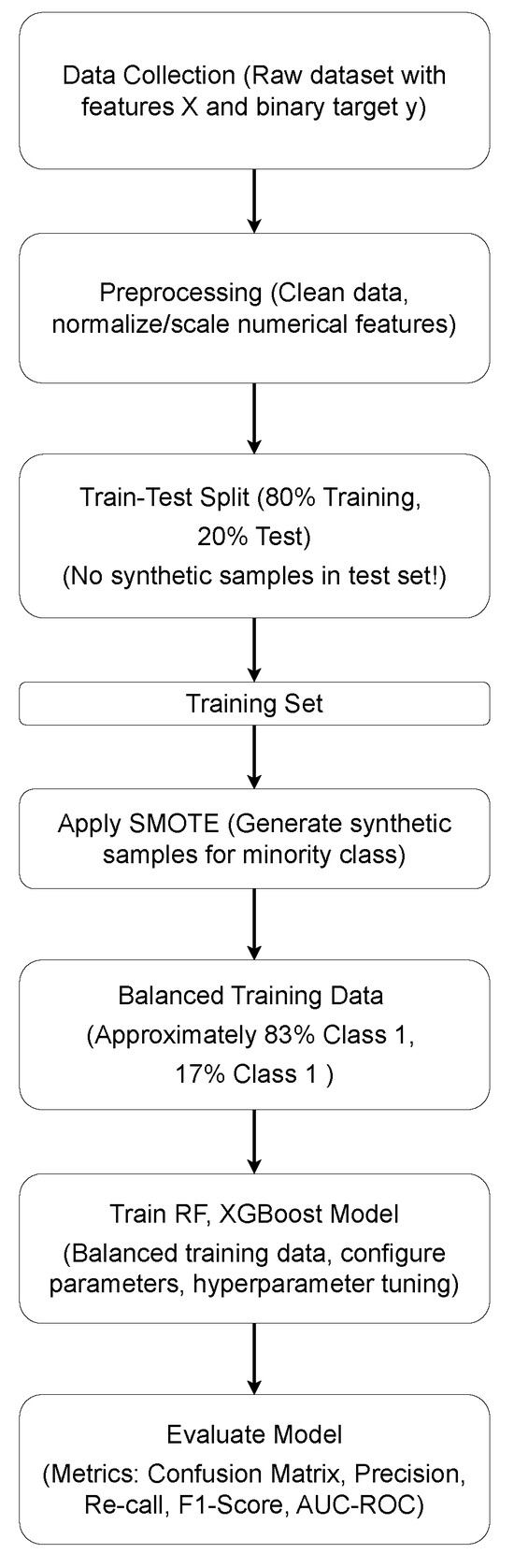To further address class imbalance, Synthetic Minority Over-sampling Technique (SMOTE) was applied in conjunction with Stratified K-Fold cross-validation. This approach ensured balanced training splits while preserving the distribution of target classes.