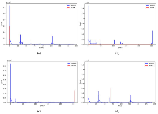 Figure 3a,b illustrate the data distribution for DoS and Fuzzy attacks, respectively. The RPM/GEAR attacks shown in Figure 3c,d exhibit a distribution pattern similar to that of the DoS attacks, as they rely on a limited set of specific CAN IDs and are not time-sensitive. In contrast, the Fuzzy attack continuously generates random CAN IDs, as detailed in Section 3, leading to a more widely dispersed distribution along the x-axis.
