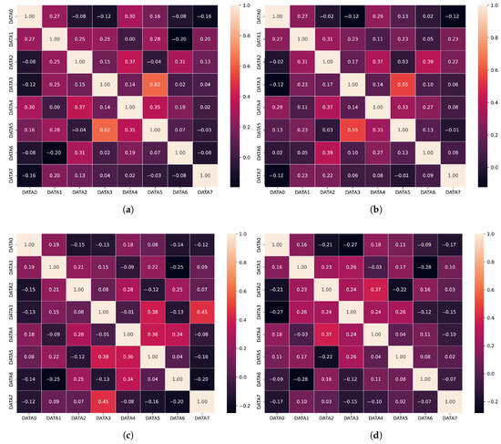 Correlation matrices for the cleaned attack datasets: (a) DoS attack dataset, (b) Fuzzy attack dataset, (c) RPM attack dataset, and (d) GEAR attack dataset for DATA0–DATA7.