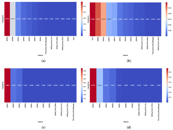 Feature importance heatmaps for the car hacking dataset: (a) DoS, (b) Fuzzy, (c) RPM, and (d) GEAR attacks. The heatmaps highlight the most influential features for detecting each attack type.