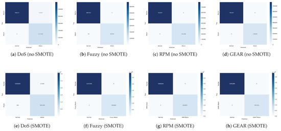 Confusion matrices for XGBoost on the car hacking dataset. Top row (a–d): without SMOTE for (a) DoS, (b) Fuzzy, (c) RPM gauge spoofing, and (d) GEAR spoofing. Bottom row (e–h): with SMOTE applied for (e) DoS, (f) Fuzzy, (g) RPM-based, and (h) GEAR-based attacks.