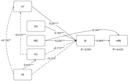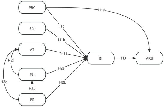 This integrated framework retains the core constructs of TPB—attitudes toward risky driving behaviors (AT), subjective norms (SN), and perceived behavioral control (PBC)—while incorporating the key elements of TAM—perceived usefulness (PU) and perceived ease of use (PE) of DAT. By combining these two well-established theories, we aim to capture both the psychological determinants of behavioral intentions (BI) and the technological factors affecting young drivers’ interactions with modern vehicles and driving assistance systems that may influence actual risky driving behaviors (ABR). The integration of the TPB and the TAM in this study is grounded in both theoretical compatibility and the context-specific demands of modern driving environments. While TPB is widely utilized to explain health-related and risk behaviors, its focus is primarily on psychological determinants of intention and behavior. TAM, in contrast, was developed to explain technology adoption, but shares structural roots with TPB through the Theory of Reasoned Action (TRA).