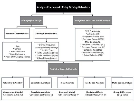 19], TPB and TAM are theoretically compatible despite their focus on different aspects of behavioral intention. Second, the complementary nature of these theories addresses the multi-faceted nature of risky driving behaviors. TPB addresses the psychological determinants of behavioral intentions through attitudes, subjective norms, and perceived behavioral control, while TAM captures the technological aspects through perceived usefulness and perceived ease of use. In the context of increasingly technology-equipped vehicles, neither theory alone is sufficient to capture the full complexity of factors influencing young drivers’ behaviors. Third, the integration is particularly relevant for young Chinese drivers, who exist at the intersection of rapid technological adoption and evolving social norms regarding driving. Young drivers in urban China represent a unique demographic that has grown up during China’s technological boom and is typically early adopters of new technologies [