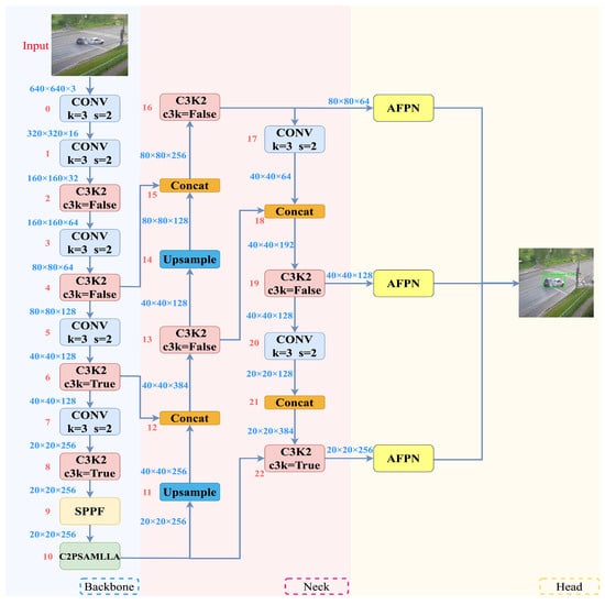 The backbone and neck components of the proposed YOLO11-AMF architecture are specifically designed to enhance multiscale feature extraction and semantic representation, both of which are critical for accurate traffic accident detection. The neck incorporates a redesigned C3k2 module, which replaces the traditional bottleneck structure with a serialized pair of C3k blocks (with hyperparameter N = 2), thereby increasing the depth of feature learning while maintaining a lightweight computational footprint suitable for real-time deployment. As illustrated in Figure 2, the improved C3k2 configuration (c3k = True) adopts deeper C3k pathways compared to the original structure (c3k = False), enabling richer and more expressive feature representations. Additionally, the architecture integrates a cross-scale feature fusion strategy through upsampling operations and lateral skip connections, facilitating the hierarchical aggregation of low-level spatial information with high-level semantic features. This design leads to the generation of more discriminative feature maps across multiple resolution levels, improving detection robustness and accuracy.