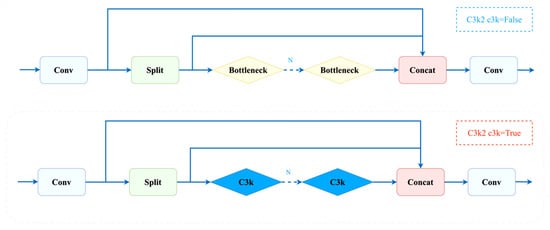 Comparison of the original and improved C3k2 module structures. The upper architecture (c3k = False) uses bottleneck blocks, while the lower version (c3k = True) serializes two C3k blocks with N = 2 for deeper feature extraction.