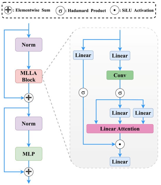 The Mamba-Like Linear Attention (MLLA) mechanism introduces a novel, Transformer- inspired attention module specifically tailored for visual recognition tasks in real-time traffic accident detection frameworks [,]. As depicted in Figure 3, MLLA diverges from conventional self-attention mechanisms, which are often computationally expensive and exhibit poor scalability with increasing input dimensions, by employing a streamlined architecture which integrates a forget gate and a linearized attention structure. This architectural simplification effectively alleviates the memory and latency bottlenecks typically associated with traditional Transformer models.