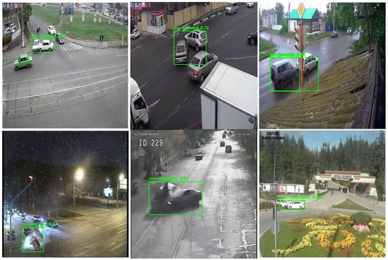 Traffic accident detection plays a pivotal role in contemporary traffic management and public safety systems []. The continued expansion of road networks and increasing vehicle density have heightened the urgency for effective and reliable accident detection technologies [,]. Traditional traffic monitoring methods, reliant on manual observation, suffer from limitations including human error and a lack of scalability. Consequently, these shortcomings are driving the adoption of automated solutions []. The automation of traffic accident detection has emerged as an inevitable trend, with the accurate and timely identification of accidents during monitoring remaining a central challenge [].