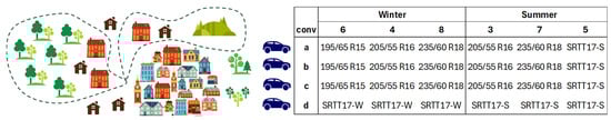 One of the vehicles (vehicle d) was fitted with reference tyres, while the remaining three vehicles with candidate tyres (vehicles a–c). For winter candidate tyres, vehicle (d) featured the reference winter tyre (SRTT17-W), while for summer candidate tyres, vehicle (d) featured the corresponding summer reference tyre (SRTT17-S). The reason for having reference tyres is that the wear of each set of tyres is compared to the reference tyres to give an index that absorbs the impact of the parameters that affect wear. The main ones, in addition to the tyre itself, are the vehicle (e.g., load, suspension), the road (e.g., surface, dust loading), driving style (e.g., longitudinal and lateral accelerations), and environmental conditions (e.g., temperature, humidity) [6,25]. The equations for the calculation of the index will be given later.