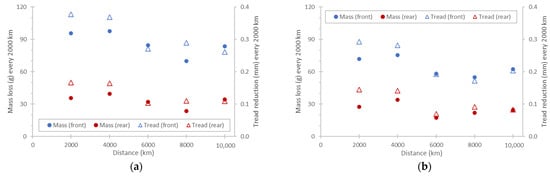 Figure 2 plots an example of the mass loss and the tread depth reduction of a candidate tyre (Figure 2a) and the reference summer tyre (SRTT17-S) (Figure 2b) every 2000 km. The averages of the two front and two rear tyres are plotted. Both tyres (and in general all tyres we tested) had higher wear at the first 4000 km and lower after 6000 km. Wear was relatively stabilised afterwards, within experimental uncertainties. This applied to both mass and tread depth. The front tyres had a higher wear rate than the rear tyres for the front-wheel-drive vehicles of this study. From this figure it is clear that when calculating a value (e.g., abrasion rate or service life), the absolute value depends on the start and end distance used (e.g., 0 to 8000 km or 4000 to 8000 km). The index (i.e., ratio to reference tyres) is less impacted by this choice, as it will be discussed later.