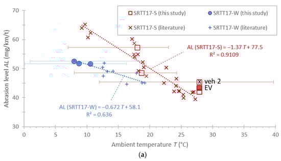 The abrasion rate and level of the reference tyres as a function of the ambient temperature are plotted in Figure 3. In addition to our tests, reported values in the literature [26] for the same circuit are plotted. According to our knowledge, the tests in the literature were carried out with the same reference vehicle as in our study. The points refer to the average temperature over the 8000 km test. For our tests, we also provide the minimum and maximum temperatures during the whole 8000 km trip, which spanned about ±10 °C from the average value.