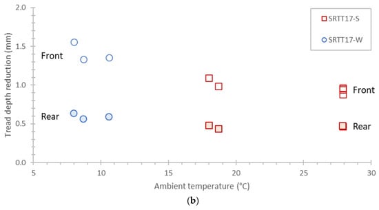 Figure 3b shows tread depth reduction after 8000 km of testing as a function of average ambient temperature. No clear effect of ambient temperature on tread wear was observed. However, the limited number of data points restricts the ability to draw statistically significant conclusions. Furthermore, temperature differences were not large enough to clearly reveal any potential effect on tread depth reduction. Finally, the data are limited to our tests, as no other literature data exist for these specific tyres. The SRTT17-S reference summer tyre had a reduction of 1.3–1.6 mm for the front tyres and around 0.45 mm for the rear tyres after 8000 km. The SRTT17-W reference winter tyre had a reduction of 0.9–1.1 mm for the front tyres and around 0.6 mm for the rear tyres.