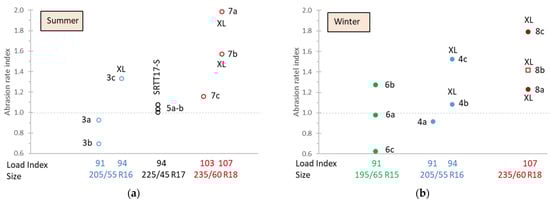 Abrasion rate index (ARI) results: (a) summer tyres; (b) winter tyres. XL indicates reinforced tyres. All winter tyres are 3PMSF, except the square point, which is only M+S.