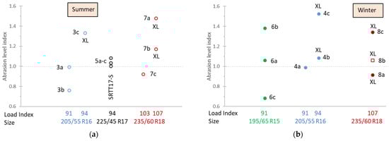 Figure 4 presents the abrasion rate index (ARI) of the candidate tyres as a function of their size and load index. Results are provided separately for summer (Figure 4a) and winter tyres (Figure 4b). Similarly, Figure 5 presents the abrasion level index (ALI) of the tyres. The results of the SRTT17-S convoy are also plotted. Note that abrasion rate is expressed in mg/km, while abrasion level is in mg/km/t. The index is calculated as the ratio of candidate tyre abrasion to the reference tyre abrasion (no matter if rate or level, as the units cancel out). Higher values indicate higher abrasion compared to the reference tyres.