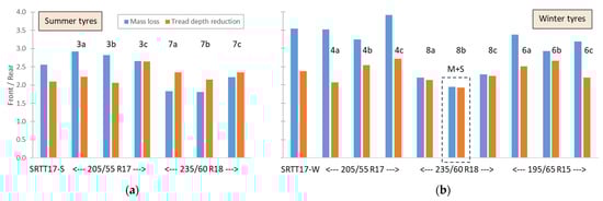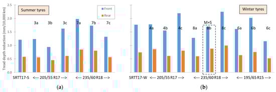 Ratio of front and rear tyres regarding mass loss and tread depth reduction: (a) summer tyres; (b) winter tyres. The M+S winter tyre is inside dotted boxes. The load distribution was 50%/50% for the 235/60 R18 tyres and 56%/44% for the rest of the tyres.
