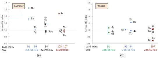 Service life index of: (a) summer tyres; (b) winter tyres. XL indicates reinforced tyres. All winter tyres are 3PMSF, except the square one, which is only M+S.