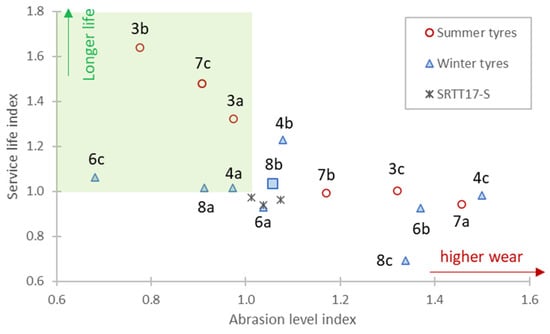 Figure 9 compares the service life and abrasion rate indices. Although, in general, higher abrasion (high abrasion rate index) should result in lower service life (lower service life index), the trend was not so clear, particularly for the winter tyres. This is because the total available tread depth is also important. For example, even if a tyre has a high abrasion rate, it may still have a long service life if the tread depth is higher than that of another tyre with low abrasion but low tread depth.