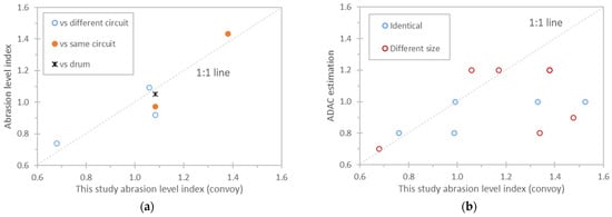 Some tyres from our study were also evaluated by others. Figure 10a compares four winter tyres tested at a different time period at the same circuit (location), at a different circuit in Germany following the UNR 117 Annex 10 requirements, and in a laboratory with the drum method (compliant to UNR 117 Annex 10). The agreement is very good, with differences less than 0.16. It should be highlighted, though, that the agreement is not always good, in particular with the drum method. Recent studies demonstrated larger differences, and the choice of the drum surface and the dispersion material between the drum surface and the tyre can have a big impact [40]. Furthermore, the on-road results might be different when comparing tests carried out at different ambient temperatures due to the different impact of the temperature on the candidate and reference tyres. The work on how to mitigate these issues is ongoing. Our tests were conducted at temperatures close to the mid-range prescribed in the regulation where the ambient temperature impact should be minimal. Figure 10b compares our results with values reported by ADAC. For five tyres, the tyre size was identical; for another six, the size differed (only the model name was the same). In seven of the eleven tyres, results from the two studies differed by less than 0.19, while for four tyres, the differences ranged from 0.33 to 0.58. There is no clear explanation for these high discrepancies. Recently, ADAC showed that the circuit is UNR 117 Annex 10 compliant. However, their past tyre studies were conducted with some differences in the procedure, the most important being that the reference tyres were not those specified in UNR 117 Annex 10, as they were conducted before the preparation and adoption of the regulation [41,42]. The choice of the reference tyre will have an impact on the absolute value of the abrasion index; however, we do not have the evidence to assess this influence. Furthermore, some of the tests were carried out in the laboratory with the drum method. Other differences, such as the ambient conditions (which were not reported) and the fact that not all four reference tyres were fitted to one vehicle, might also have contributed to the differences.