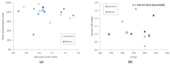 Comparison of this study’s results with other studies: (a) wear grading [43]. The square symbol indicates only M+S winter tyres; (b) UTQG. x” indicates values that were assumed based on similar tyres but not reported on the tyre.
