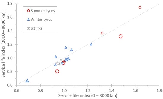 As was discussed in Figure 4, the wear of the tyres is higher at the beginning, and consequently, the wear ratio to the reference tyre for the first thousands of km might be very different. Thus, the absolute service life will be different depending on the start distance, and the service life index might be different as well. For example, the absolute service life of the reference tyres increases from 45,000 km to 52,000 km when changing the start distance from 0 to 2000 km. In order to investigate the impact of including or not the ‘break-in’ period to the service life index, we compared the service life indices applying Equations (5) and (6) with both starting distances, Ds, of 0 km and 2000 km. Figure 12 plots the results. In general, the agreement is good (slope 1.04, R2 = 0.9), indicating that using ratios minimises the impact of influencing parameters. Although there are a few points with higher deviations, it should be remembered that the measurement uncertainty of the tread depth measurement is high, and these differences do not necessarily have to do with the actual tyre behaviour. In the UNR 117 Annex 10 methodology, the wear is measured only at the beginning and at the end of the test. Adding a point at 2000 km would increase significantly the time (and cost) without clear benefits. It should be remembered that the service life index is an index, and the final driven distance with the same tyres depends on many other parameters (roads, driving style, etc.).