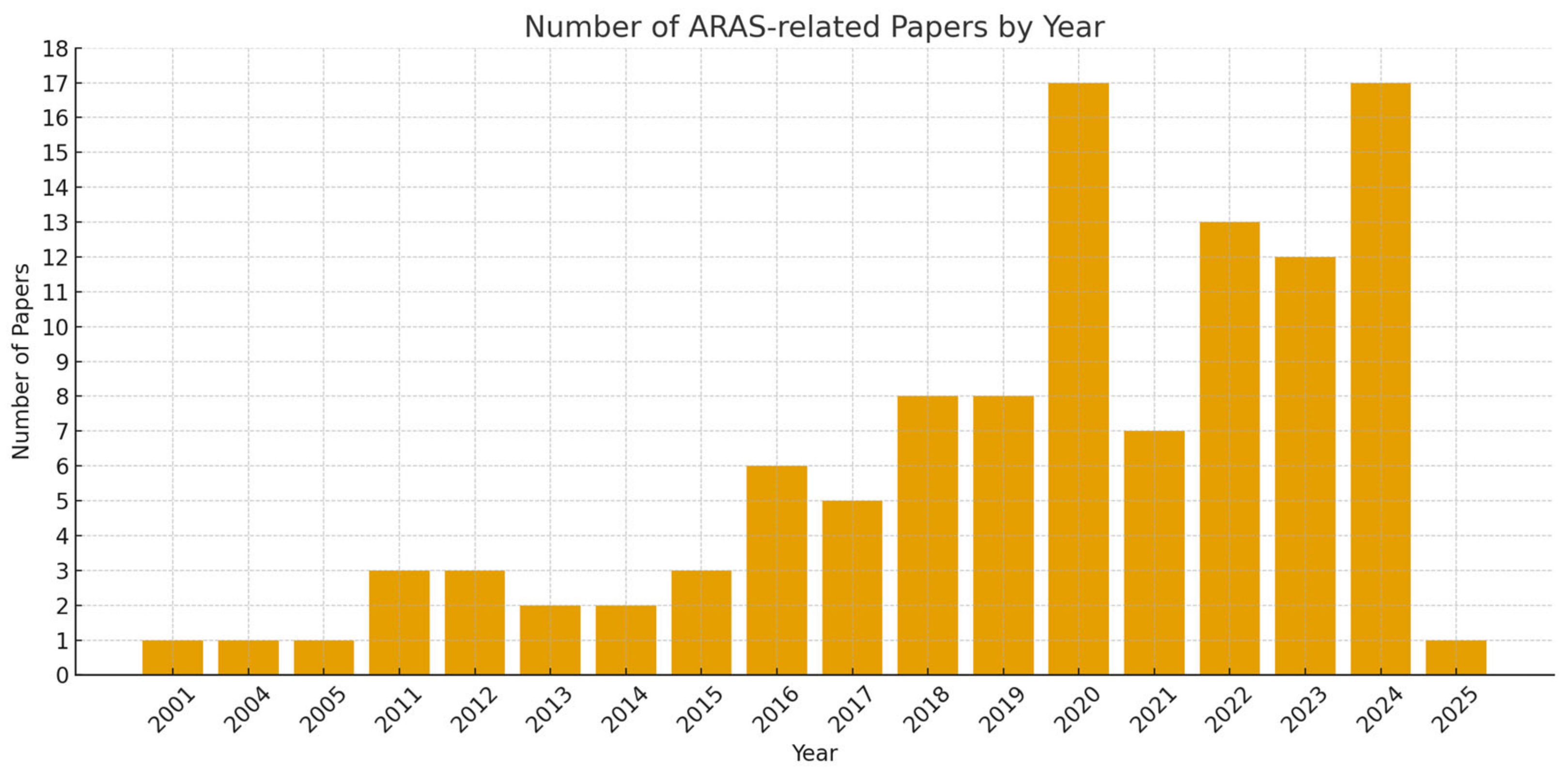 Google Scholar, IEEE Xplore, and ScienceDirect were used to identify relevant articles from peer-reviewed journals, conference proceedings, and established datasets in the fields of intelligent transportation systems and computer vision. The selection criteria prioritized studies evaluating ARAS or related advanced driver assistance systems (ADAS) in relation to environmental factors, such as sun, rain, fog, and snow. A special focus was placed on papers presenting empirical results, technology comparisons, or novel methods involving Radar, LiDAR, and camera-based systems. A total of 136 papers were selected. To better understand the evolution of research activity in the ARAS field, the publication years of the reviewed articles were analyzed. As illustrated in