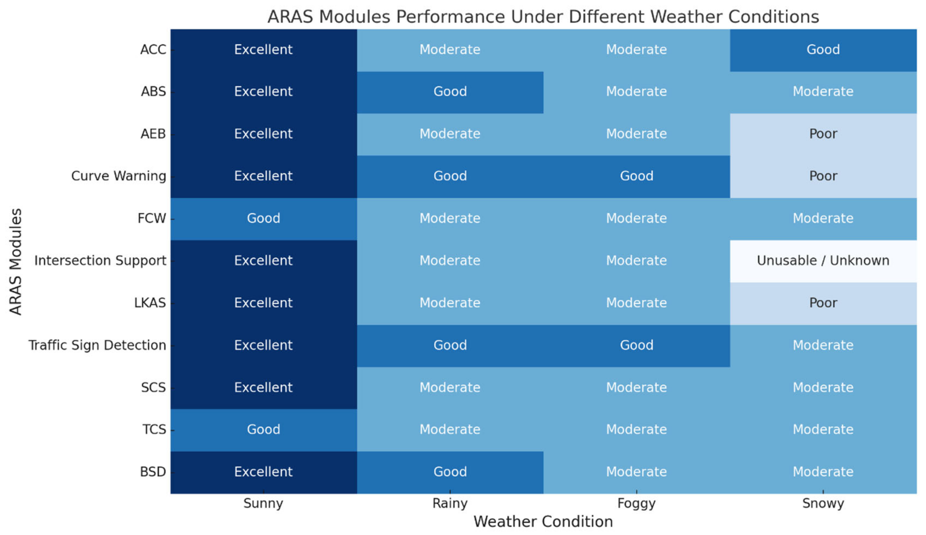 This analysis suggests that while many ARAS components are effective in favorable weather, there is a need for improvement in perception and control systems to handle low-visibility or low-traction environments, particularly for systems that rely heavily on camera input.