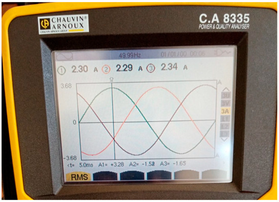 Before commencing the load tests (Figure 3), the system was operated at low rotational speed to verify readiness. This preliminary run allowed the drivetrain components to be inspected under minimal stress. During this phase, a power quality analyzer monitored the electrical parameters, confirming correct inverter output and signal stability. These checks established safe operating conditions prior to applying the full load to the twin PMSM system.