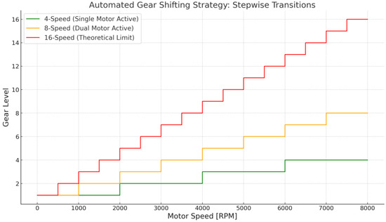The Figure 4 illustrates a stepwise automated gear shifting strategy for an electric drivetrain architecture featuring two identical electric motors, each connected to a multi-speed transmission. The horizontal axis represents motor speed in revolutions per minute (RPM), while the vertical axis denotes the gear level engaged at a given speed.