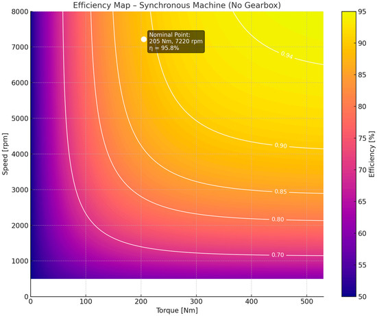 This efficiency map illustrates the performance of the synchronous machine across the full torque–speed operating range (Figure 6). It identifies regions of elevated efficiency and delineates areas where losses become significant. The nominal operating point (205 Nm, 7220 rpm, η = 95.8%) is indicated as a benchmark for assessing the machine’s energy conversion performance.