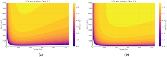 The integration of four discrete gear ratios (Figure 7 and Figure 8)—4.5:1, 3.0:1, 2.0:1, and 1.2:1—effectively enhances the efficiency map of the synchronous machine by shifting its operating points toward regions of higher energy conversion efficiency. Each gear ratio modifies the torque-speed relationship at the motor shaft, allowing the machine to operate closer to its optimal efficiency range under varying load and speed conditions.