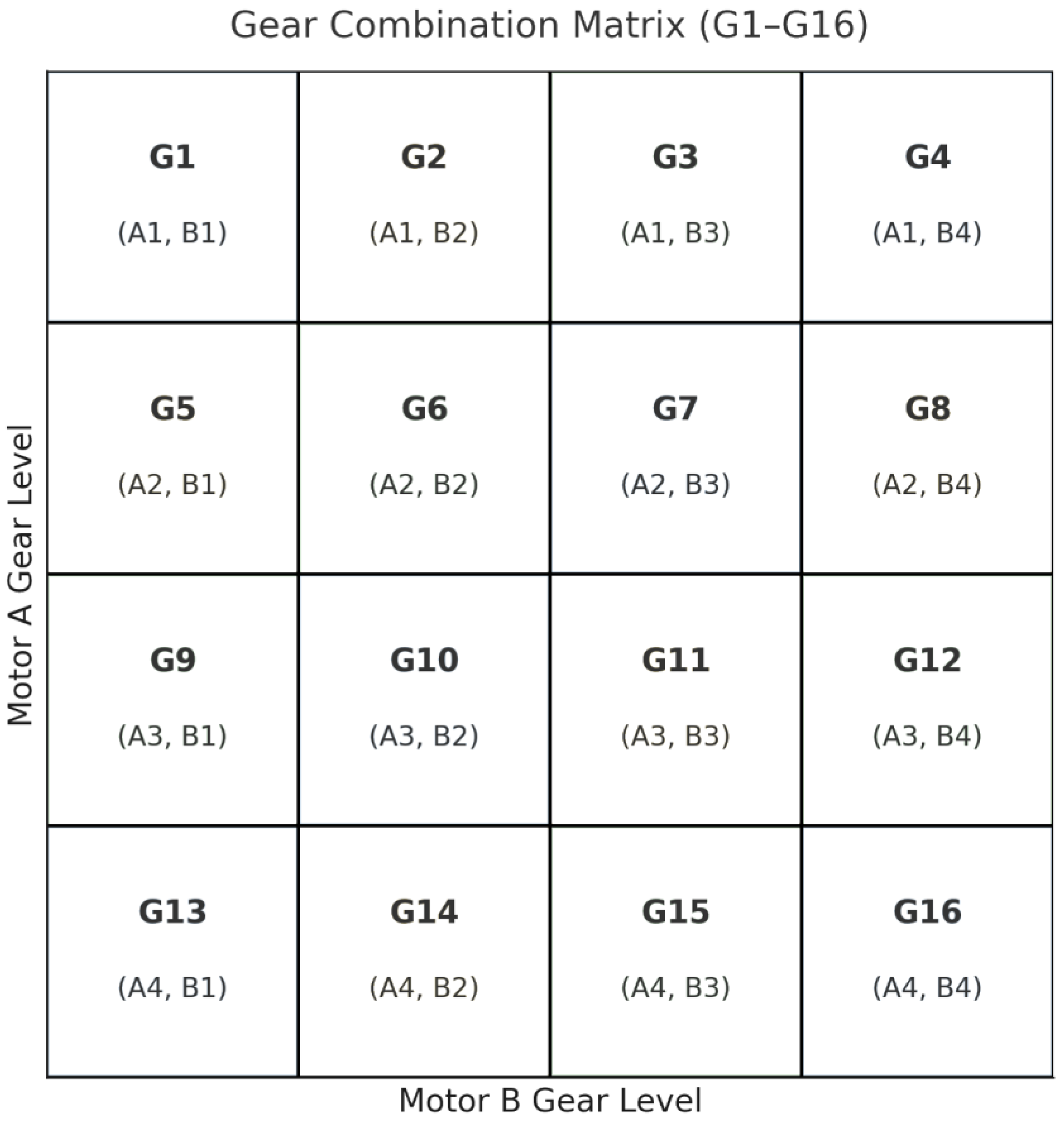 Since the effective gear ratio is determined by the harmonic mean of the two selected gear ratios, the control system must evaluate not only individual gear states, but also the resulting equivalent ratio and its interaction with the combined efficiency maps of the motors and gearboxes. This involves constructing a real-time lookup matrix or optimization table where each of the 16 possible gear states is mapped to expected motor efficiency, torque availability, and mechanical constraints.