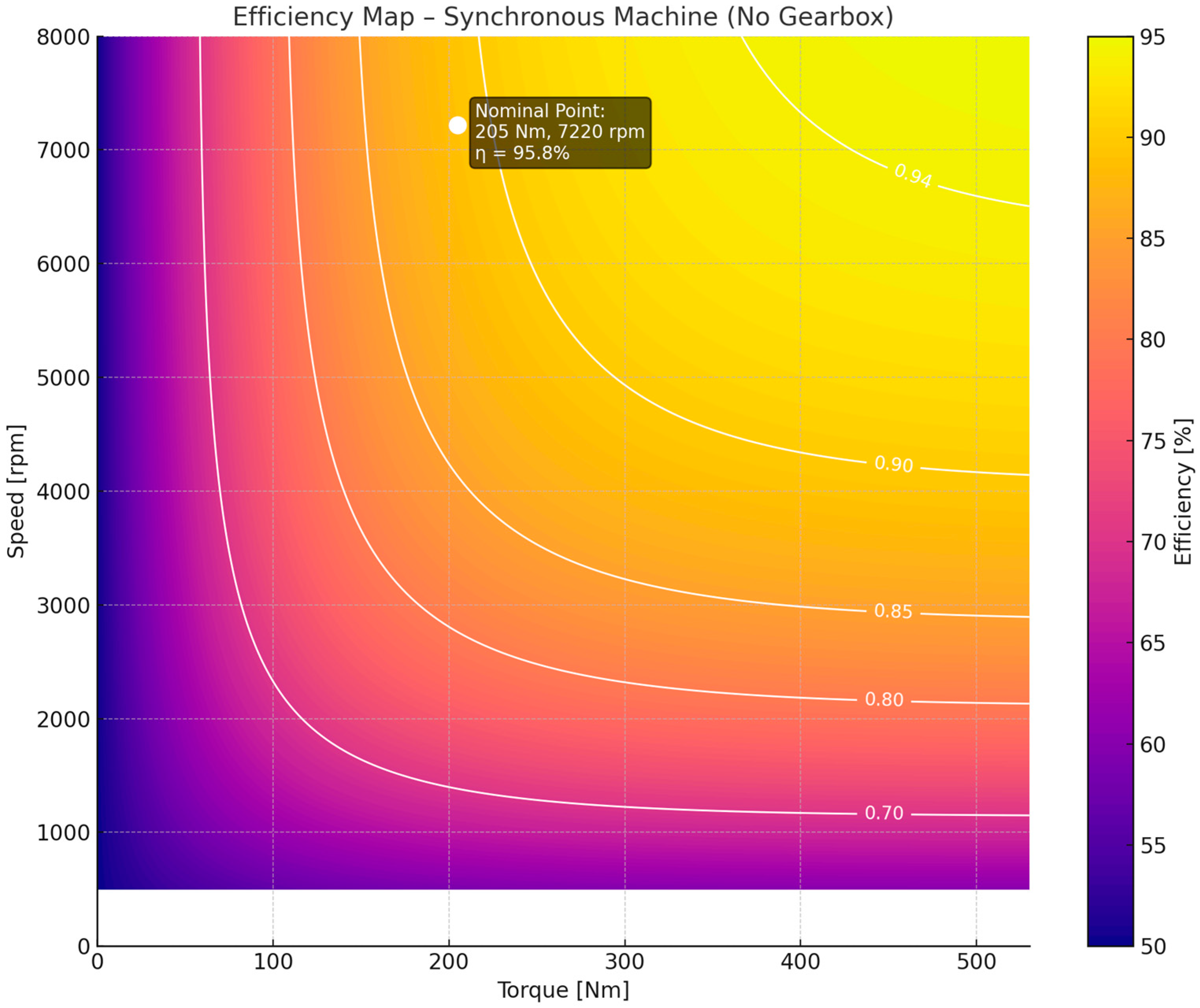 Figure 6). It identifies regions of elevated efficiency and delineates areas where losses become significant. The nominal operating point (205 Nm, 7220 rpm, η = 95.8%) is indicated as a benchmark for assessing the machine’s energy conversion performance.