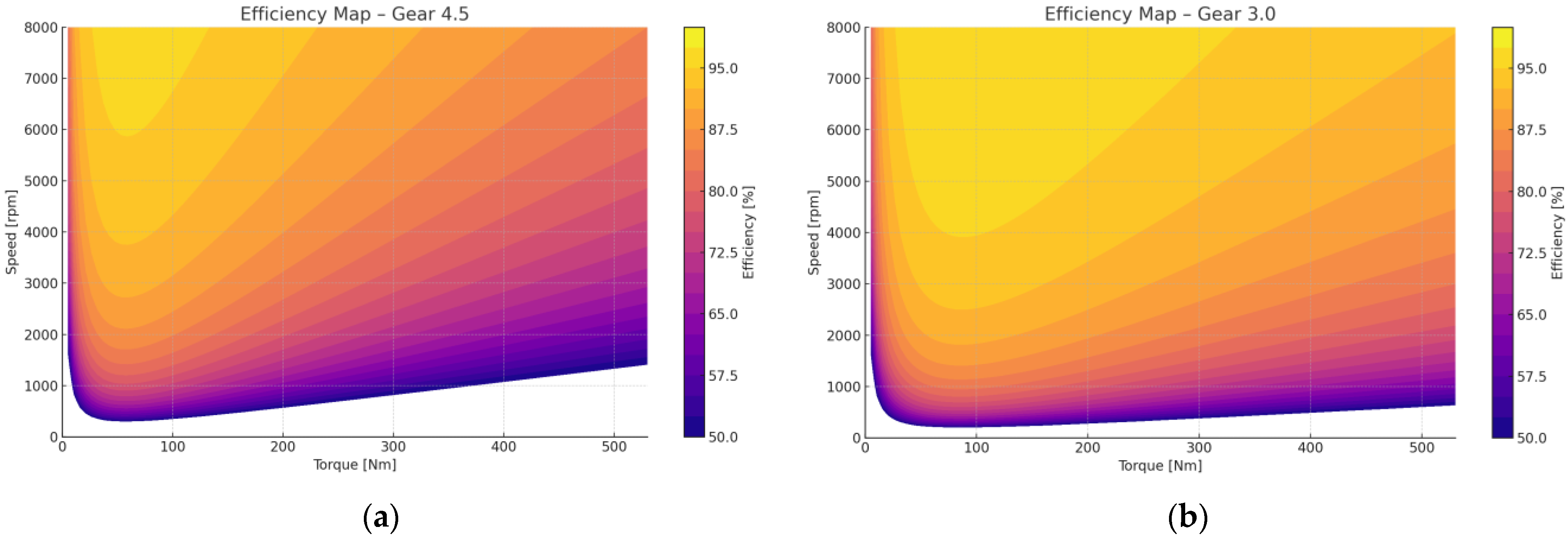The 4.5:1 gear stage provided excellent efficiency at high torque and low speed, making it suitable for launch and climbing conditions. The 3.0:1 and 2.0:1 gears showed balanced behavior, favoring mid-range operating points such as urban driving or steady acceleration. The contour plots clearly illustrated how the efficiency peak shifts with each gear, supporting the strategic use of multi-speed transmissions in electric drivetrains.