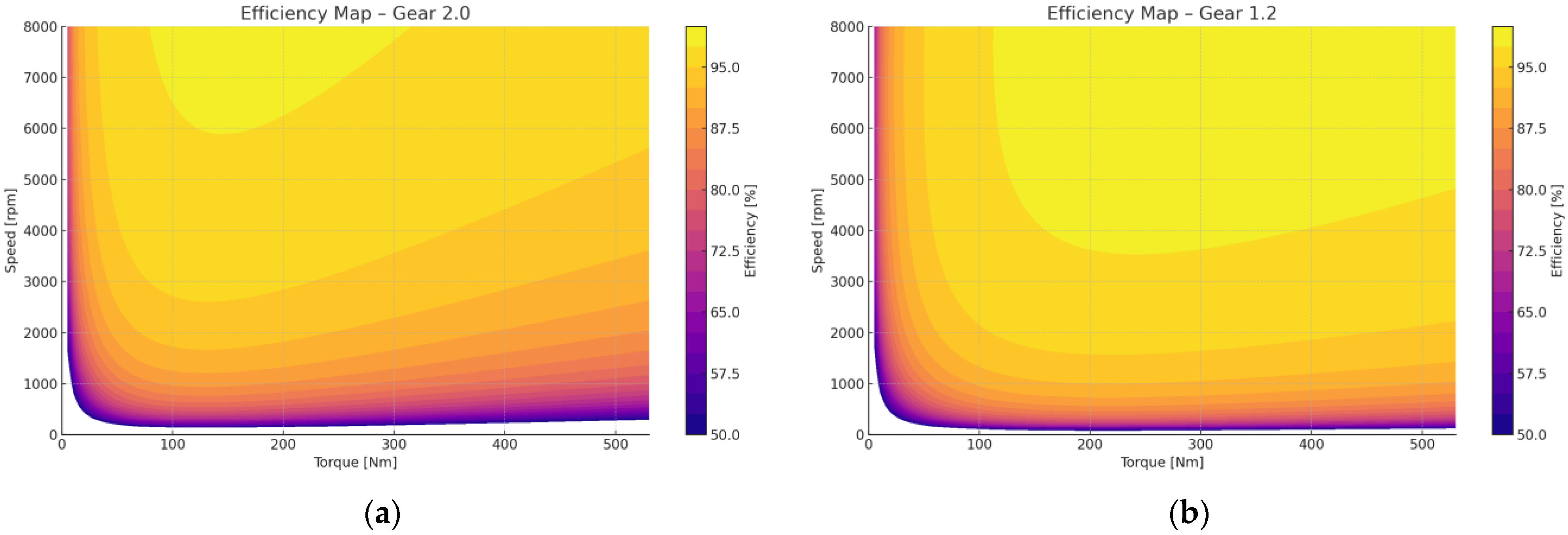 Removing the color scale in the final comparative plots improved visual clarity, emphasizing contour shapes and efficiency gradients across operating regions. The results confirm that appropriate gear ratio selection can substantially enhance energy utilization in electric powertrains by keeping the machine within its optimal efficiency envelope.