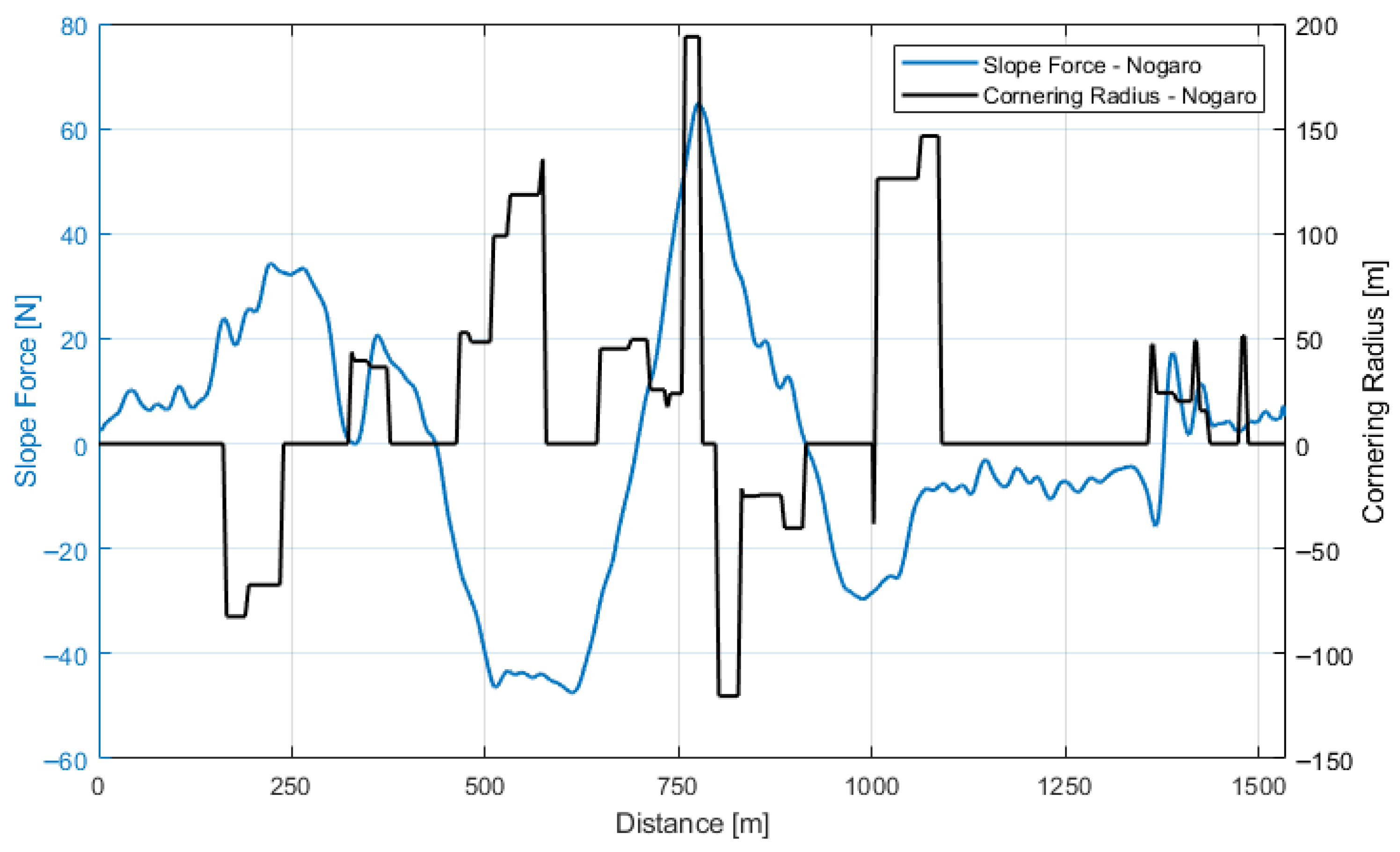 . The cornering radius and distance of each segment from the start were recorded and stored in the track model. This information was used to calculate the cornering radius and slope force