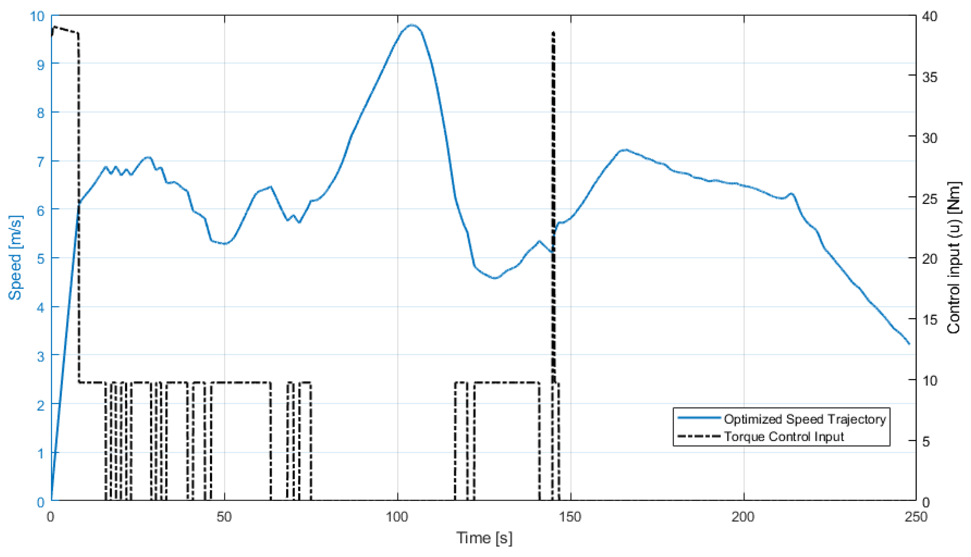 is the applied reference torque. The energy is computed at each simulation step, and the integral yields the total energy consumption. The optimization process is primarily driven by these two parameters. The standby consumption of auxiliary electrical components is neglected in the current model. The optimized driving strategy is shown in