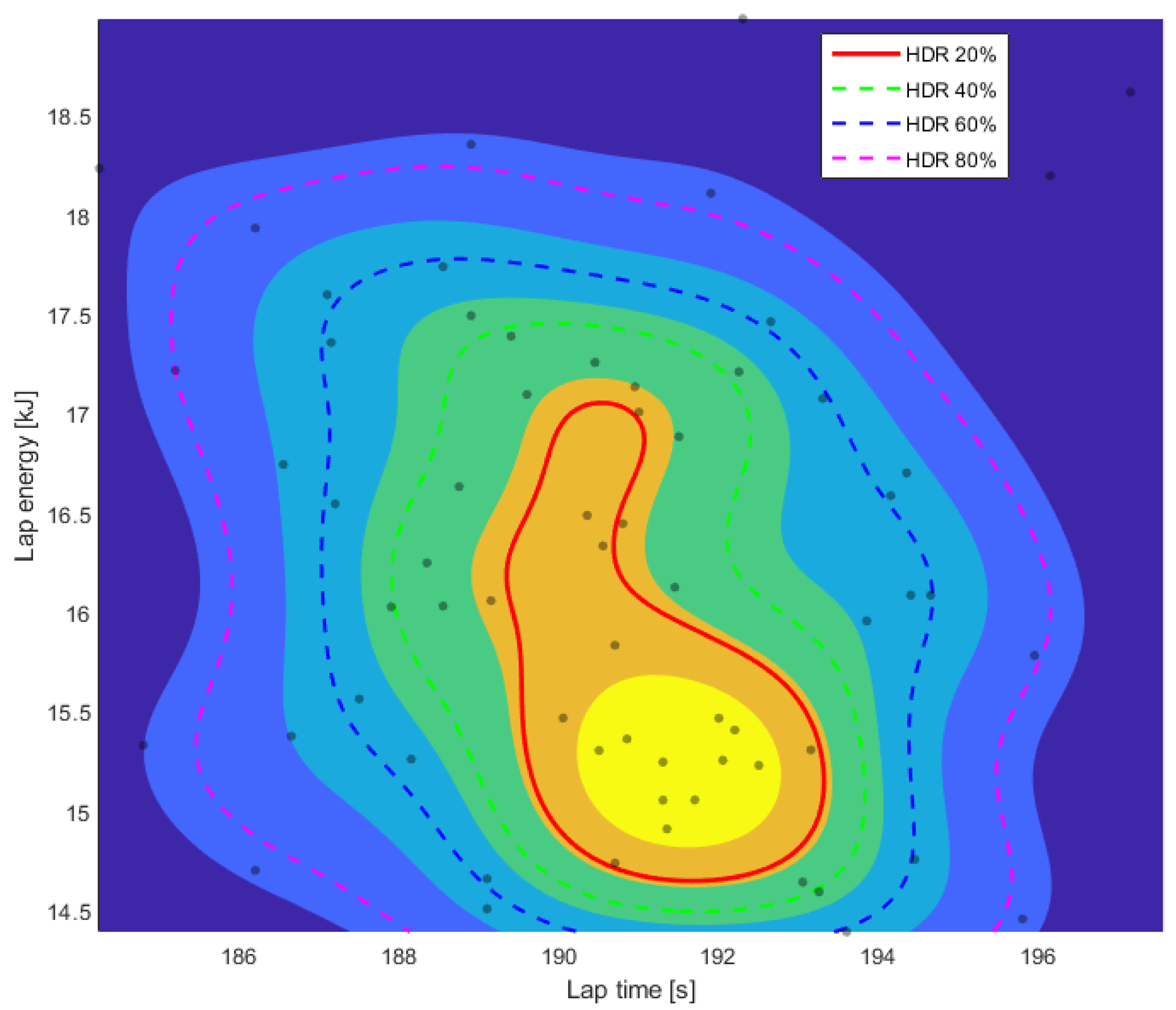 Figure 5 illustrates the distribution of lap energy versus lap time, based on 69 laps recorded during the latest Shell Eco-marathon in Poland at the Silesia Ring. The scatter points show the raw data, while high-density region (HDR) contours from a two-dimensional kernel density estimation (KDE) at 20%, 40%, 60%, and 80% highlight the regions containing the corresponding share of the data. The innermost contour (HDR 20%) indicates that 20% of the laps are concentrated around the target lap time of 191 s, within an approximate 3 s range. It can also be observed that around 80% of the laps were completed within a 10 s range, while extreme deviations extend the overall range of human driving performance to 17.3 s. The lap energy consumption shows higher variability (coefficient of variation 7.3%), primarily caused by external disturbances. This analysis indicates that the experienced driver maintains the target lap time with a standard deviation of 3.41 s, suggesting that a properly designed controller could both respect the lap time target and exploit favorable external conditions. These findings motivated the research towards the design of a practically applicable controller.
