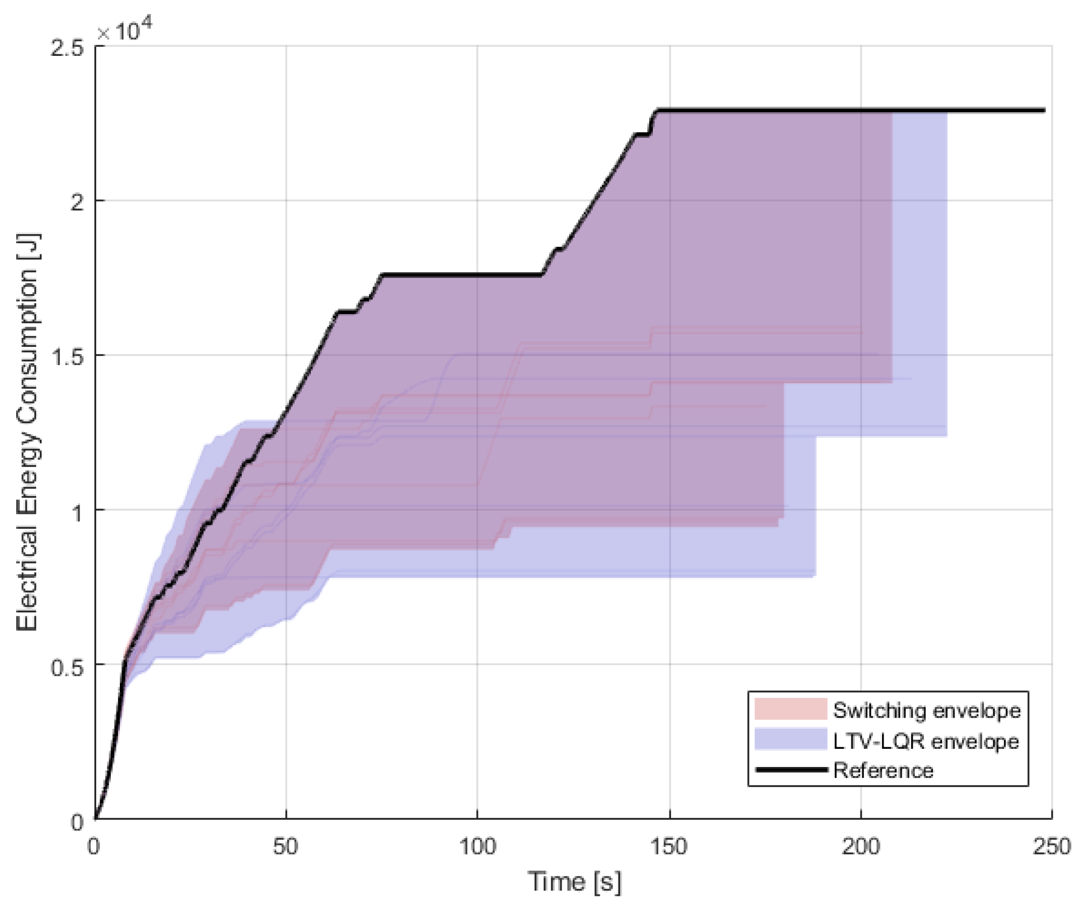 It is clearly visible that headwind-dominant cases are not adequately handled by the Switching algorithm, as it tends to exceed the time limit and shows greater variance compared to the reference. In contrast, the LTV-LQG controllers easily follow the predefined time constraint. Although the Switching strategy may result in lower energy consumption in some cases, these simulation attempts fail to meet the timing requirements.