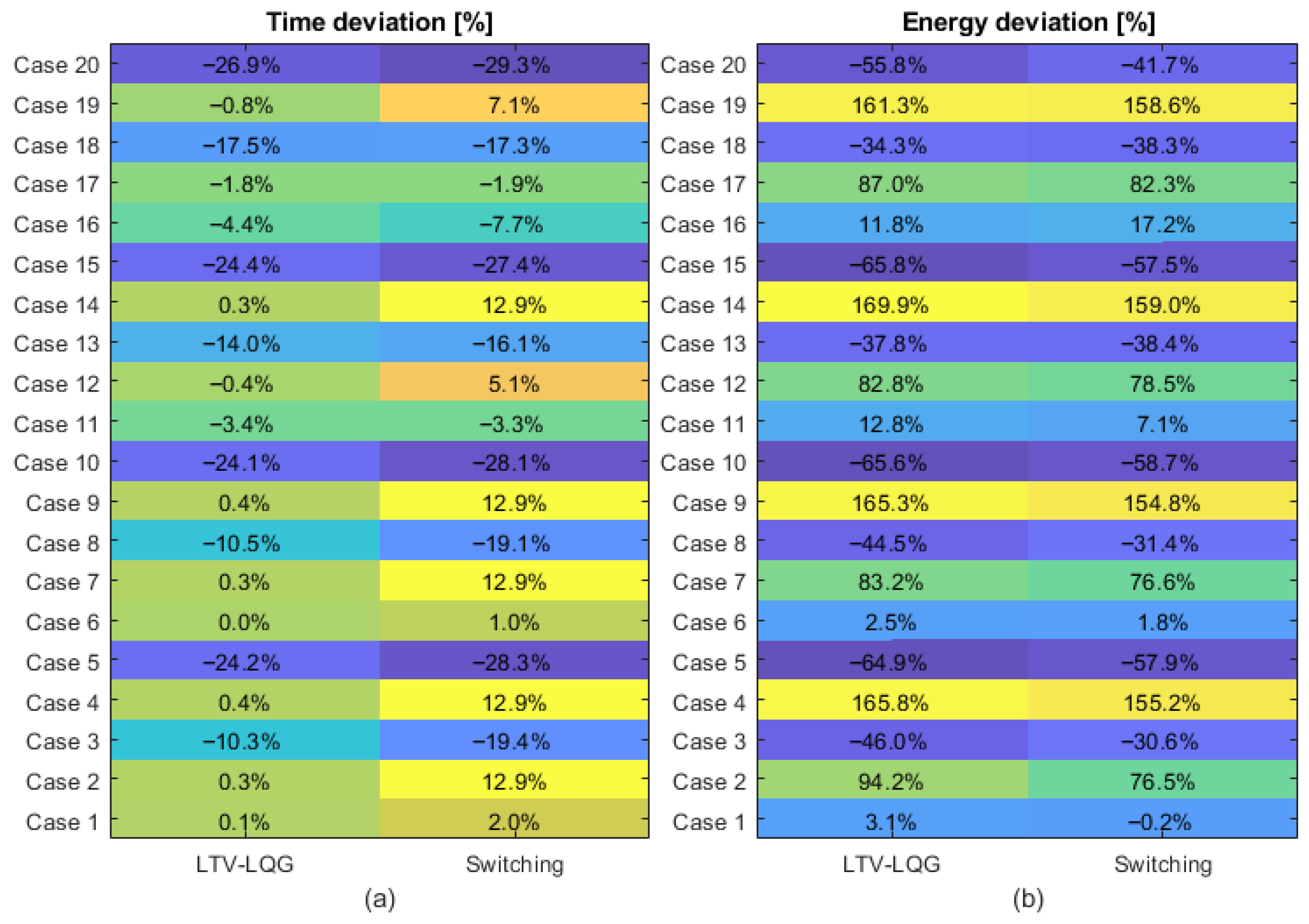 Figure 11, where the deviations from the reference values are presented in the form of a heatmap, allowing for a clearer interpretation of the relationship between the time deviation and the energy deviation. The simulation was terminated at 280 s if the trajectory end-distance value was not reached. In scenarios with strong headwinds, this issue could occur with the switching control approach. The LTV-LQG controller achieved up to 15.4% lower energy consumption compared to the switching control in tailwind dominant scenarios (case 3).