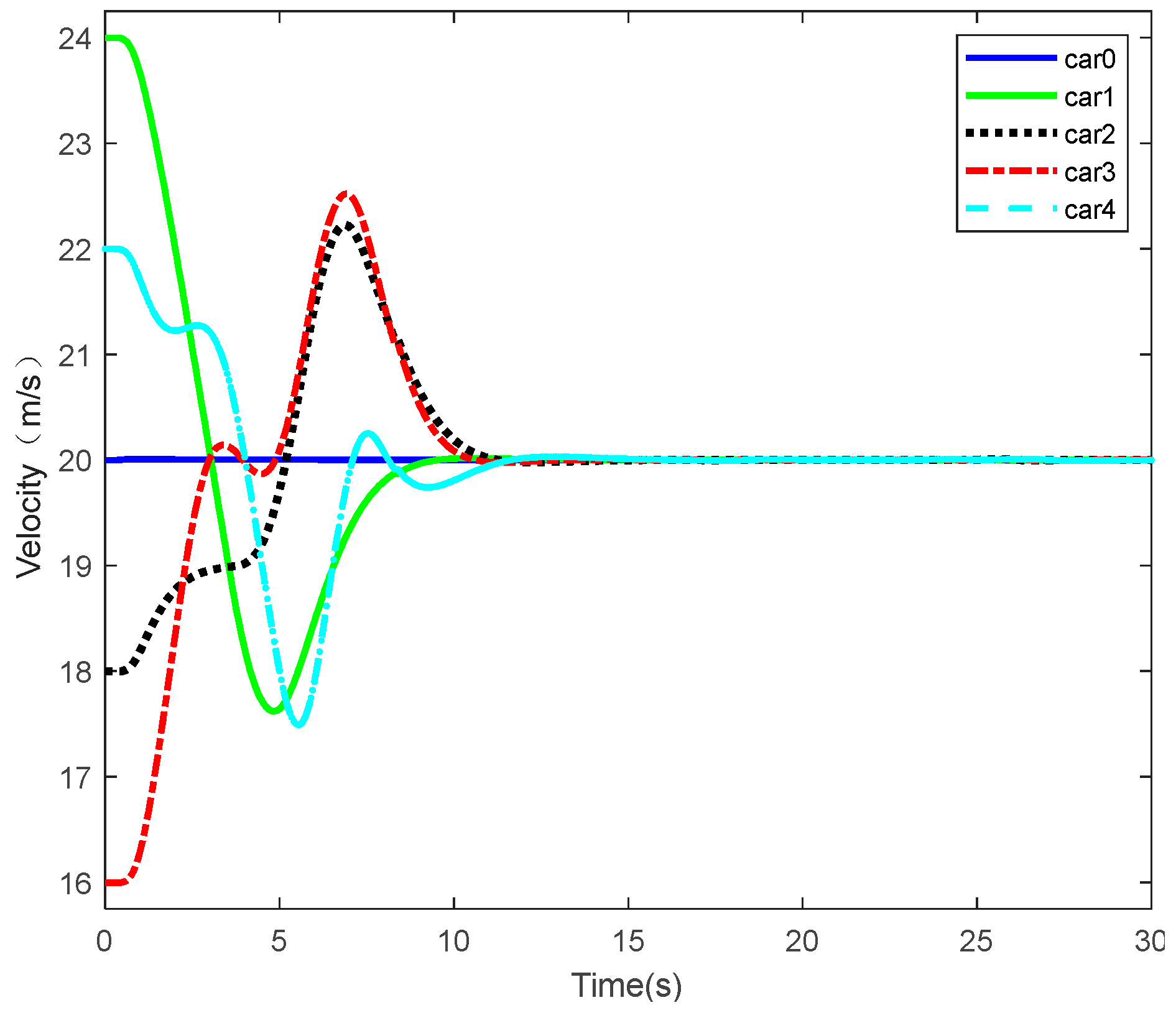where v 0 ( t ) denotes the actual velocity of the leader vehicle. Within the proposed framework, the leader is not subject to control; rather, its velocity is manually specified and broadcast to the follower vehicles through the adopted communication topology. This predefined velocity acts as the external input that governs the platoon dynamics. d i 1 , i denotes the desired distance between the vehicle i and its immediate predecessor. The choice of d i 1 , i significantly influences the geometric configuration of the vehicle platoon. Common platoon geometries include constant spacing, constant time headway, and nonlinear spacing policies. In this study, a constant spacing policy is adopted to enhance the traffic throughput of the platoon: