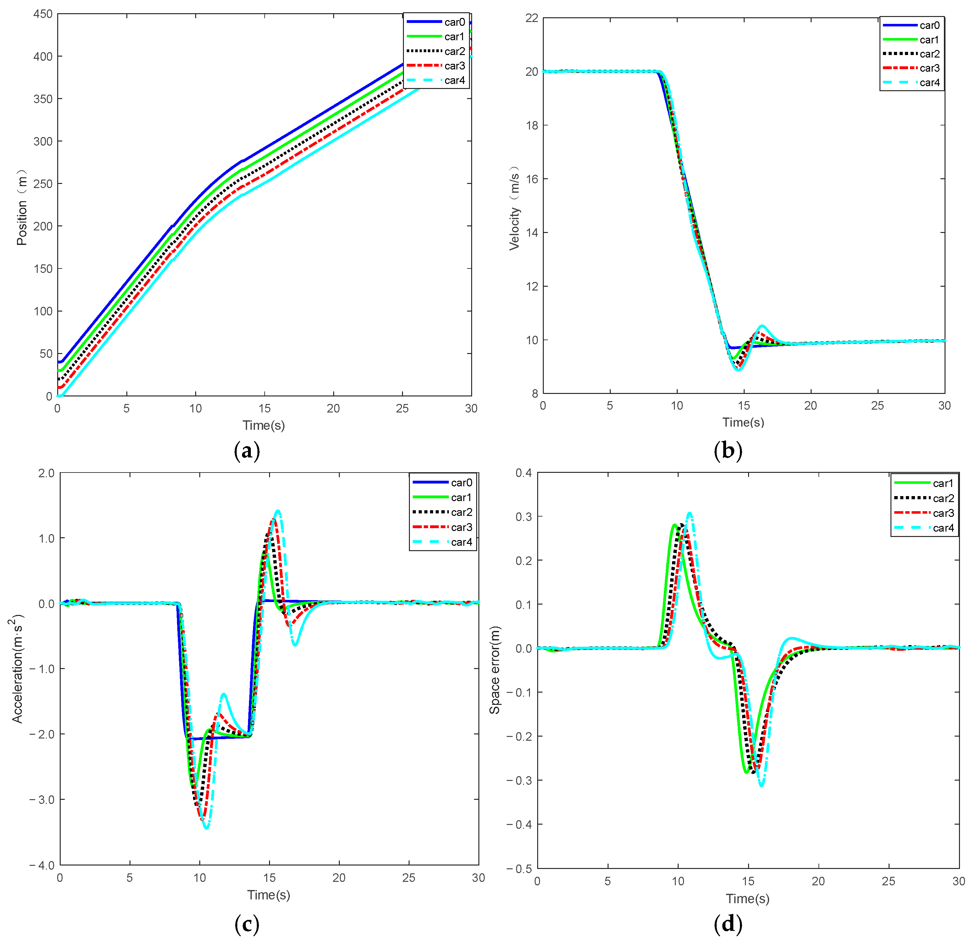 Figure 5. State trajectories of individual vehicles under decelerating scenario. (a) Position state trajectories; (b) velocity state trajectories; (c) acceleration state trajectories; (d) spacing error trajectories.