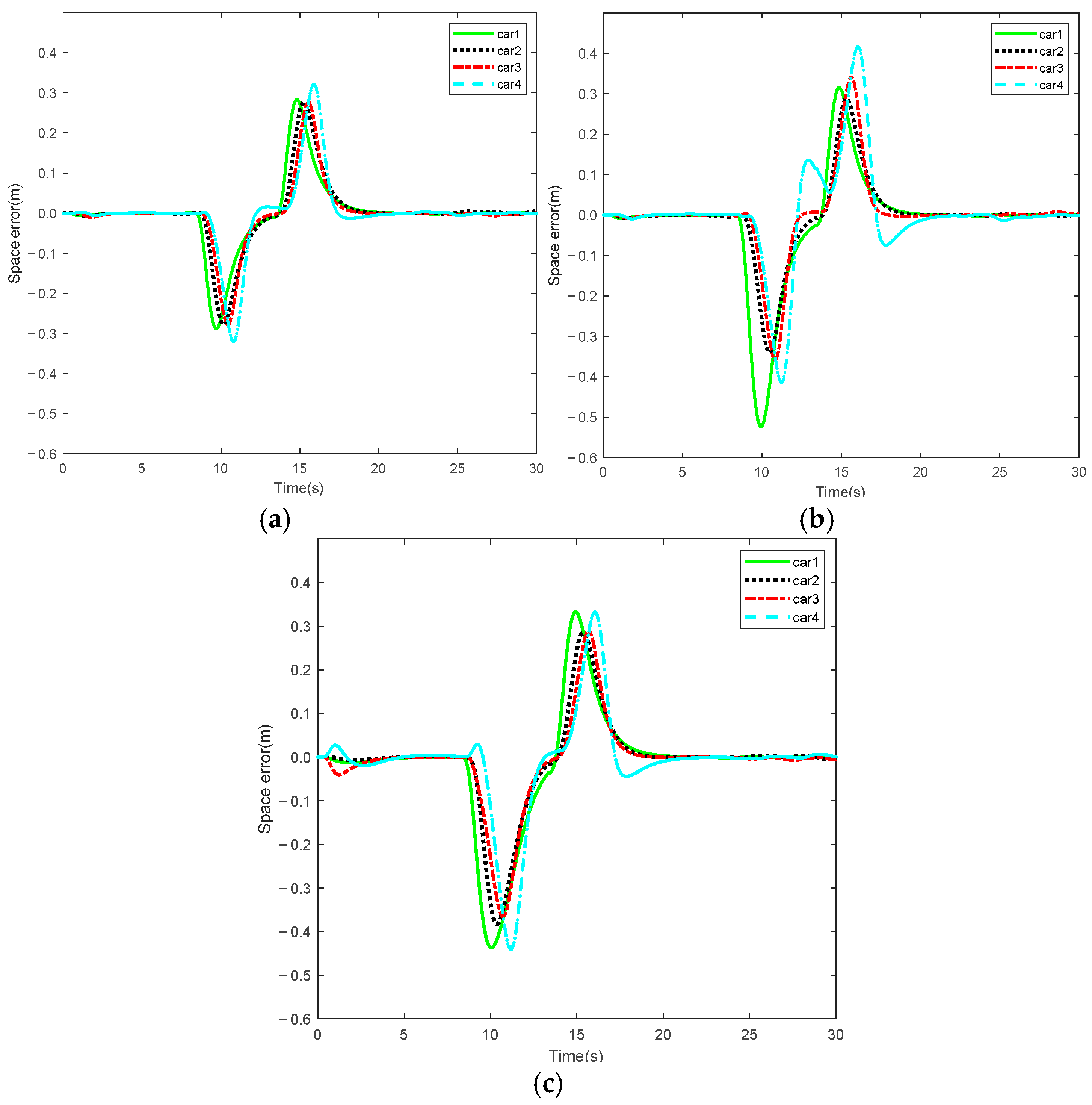 Figure 8. Comparison of tracking accuracy under three ADMM. (a) Space error under the proposed ADMM; (b) space error under the heuristic ADMM in [21]; (c) space error under the ADMM in [26].