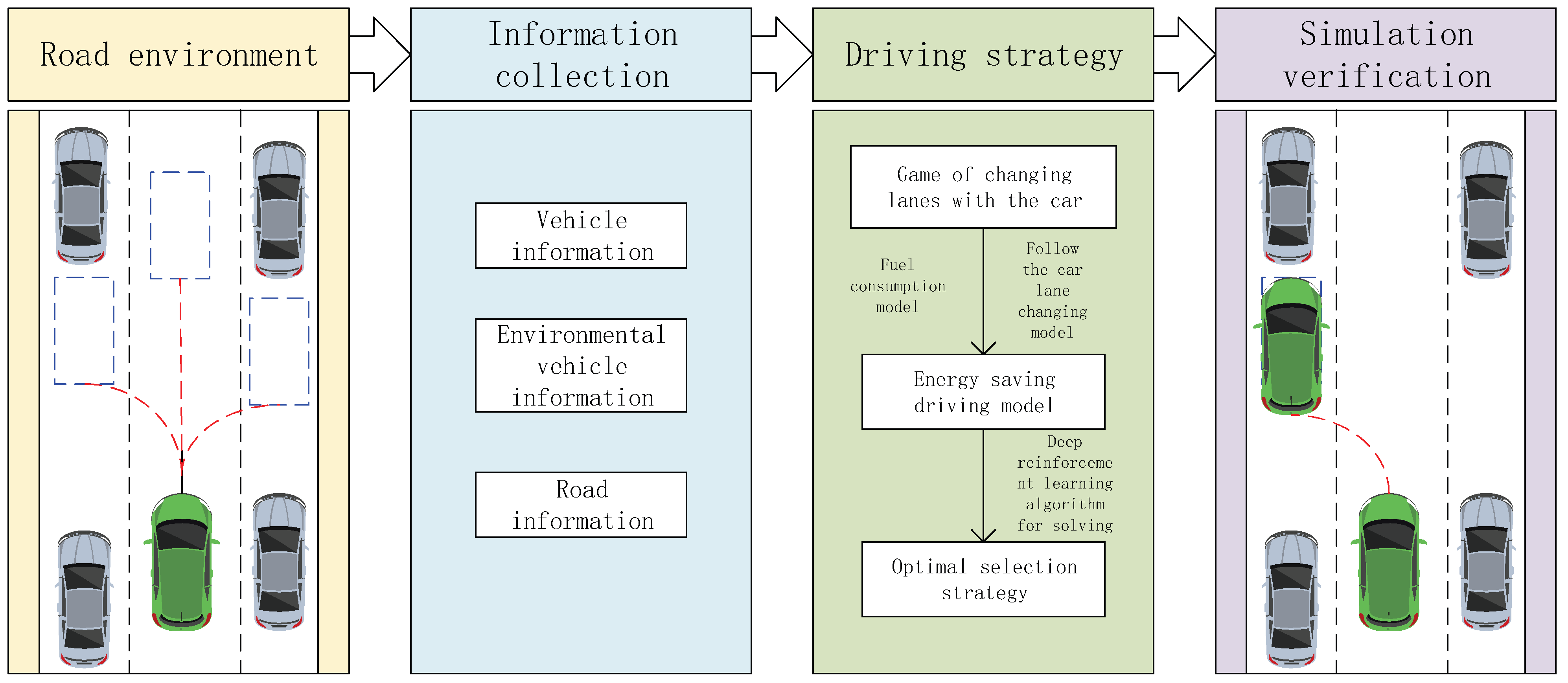 - Based on the in-depth analysis of traffic flow frequency changing sections, combined with the Internet of vehicles technology, the application framework of energy-saving driving strategy for traffic flow frequency changing sections is constructed. Its core is that the network connected autonomous vehicles operate in the vehicle road collaborative environment. Relying on the high-precision and low delay real-time traffic information transmitted by the vehicle network platform, the collaborative decision-making module of Cavs can generate the global or local optimal lane change strategy, so as to realize the collaborative optimization of path planning and lane maintenance/transformation.