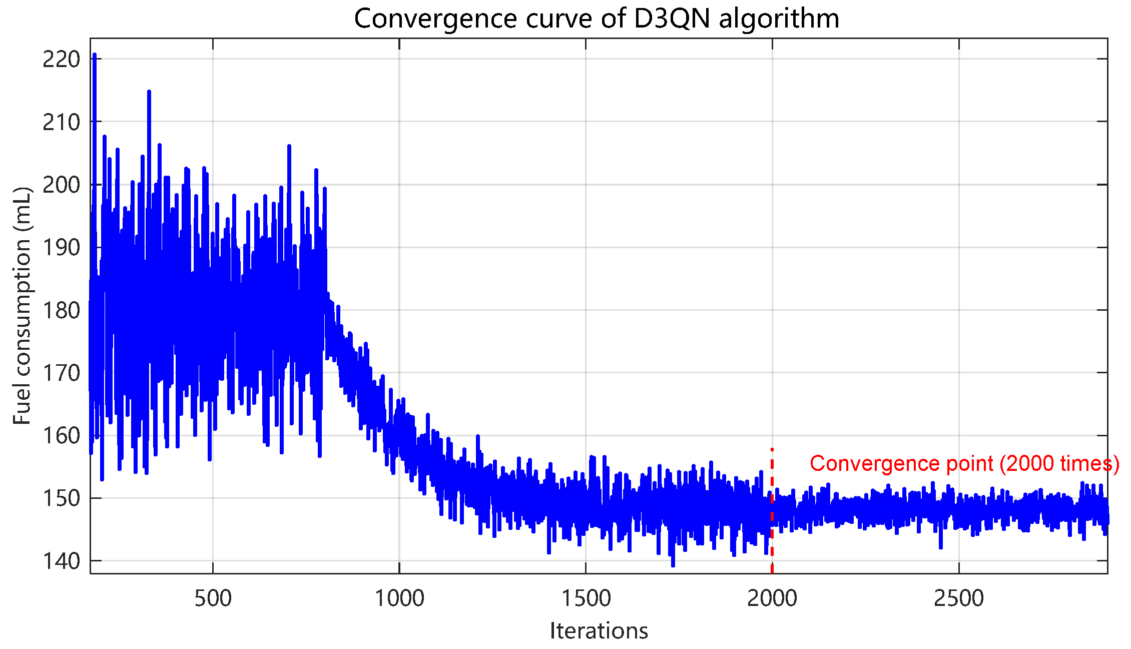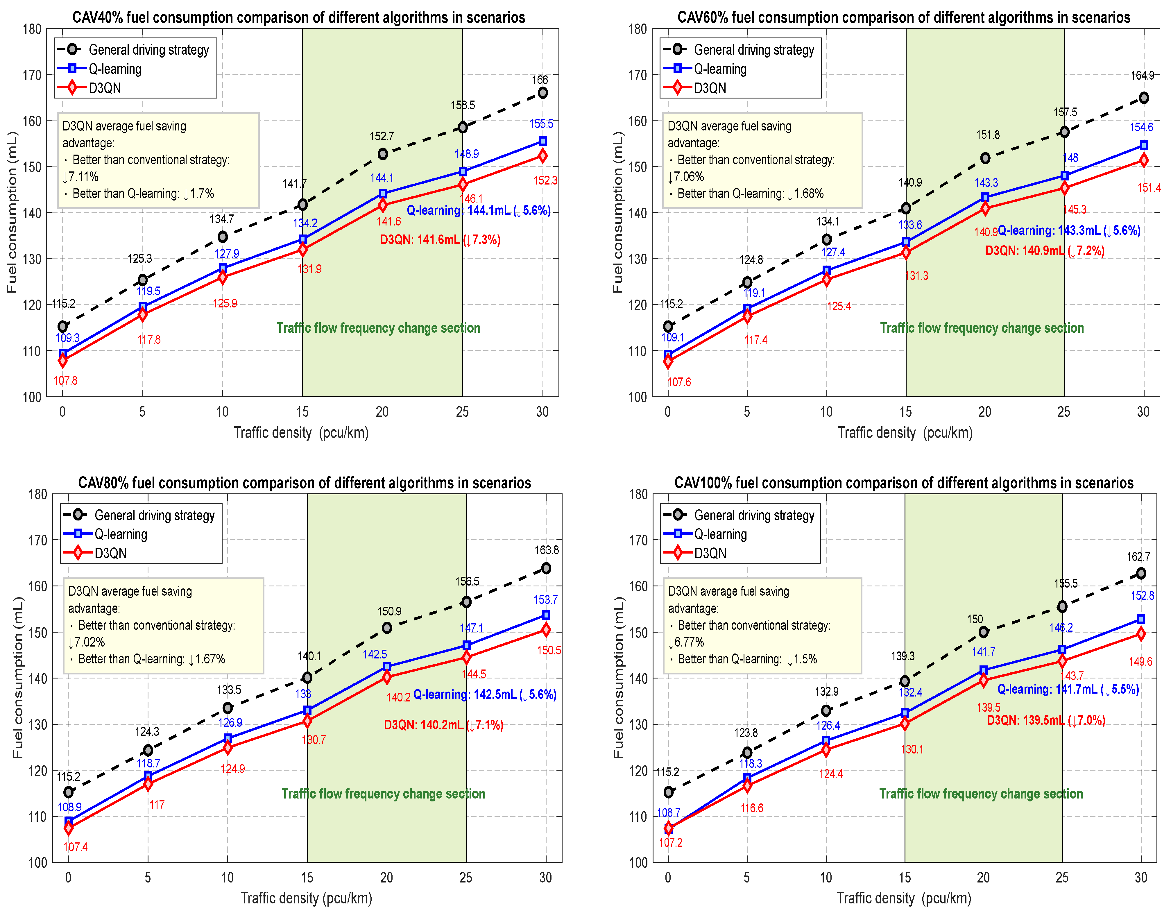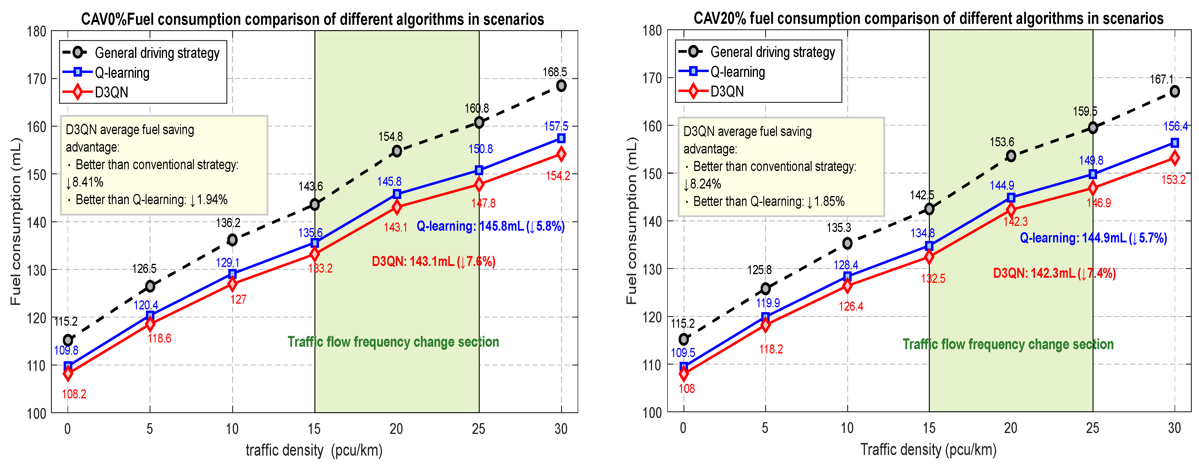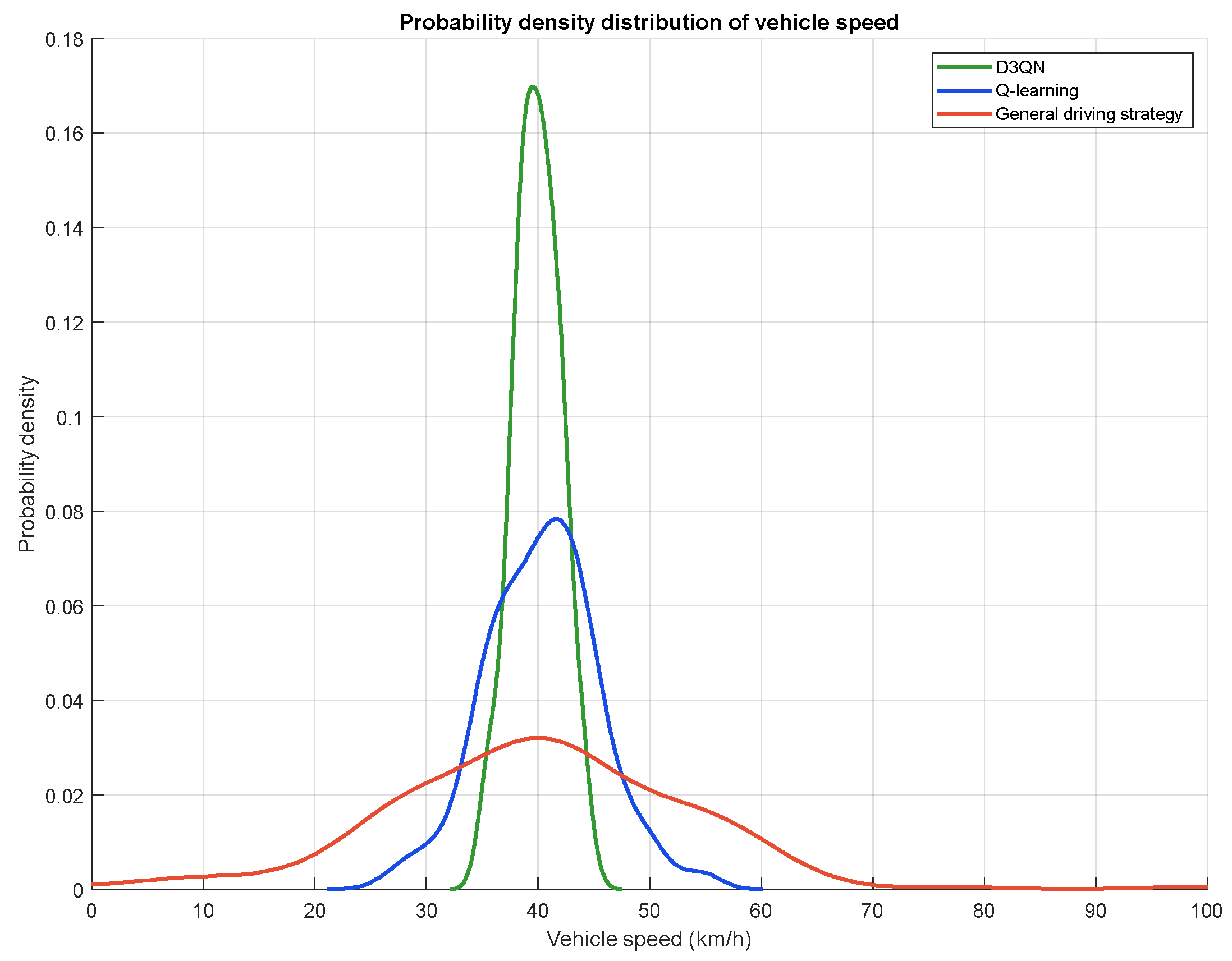 - The simulation scenario is from the intersection of Haigang road and Binhai Avenue in Qingdao to the intersection of dawangang road and Binhai Avenue. According to the simulation results, compared with the conventional strategy, D3QN strategy can save 8.41%~6.67% of fuel consumption under different proportions of intelligent connected vehicles (CAV); Compared with Q-learning strategy, it can still save 1.94%~1.5% of fuel consumption. And with the increase of traffic density, this energy-saving advantage is more obvious. When the traffic flow density increases from 0 to 30 pcu·km−1, the increase of fuel consumption with D3QN strategy is more gentle, indicating that it has stronger energy-saving adaptability in congestion scenarios. In terms of traffic flow stability, D3QN strategy can effectively reduce the speed fluctuation. Through the quantitative analysis of the standard deviation, the vehicle speed of the conventional strategy fluctuates violently in a short time. Although the Q-learning strategy has improved, the speed fluctuation of the D3QN strategy is the lowest. From the probability density distribution of vehicle speed, the D3QN strategy can centrally control the vehicle speed in the range of 30~50 km/h, significantly improve the stability of traffic flow, and reduce the energy consumption waste and traffic efficiency loss caused by frequent acceleration and deceleration.