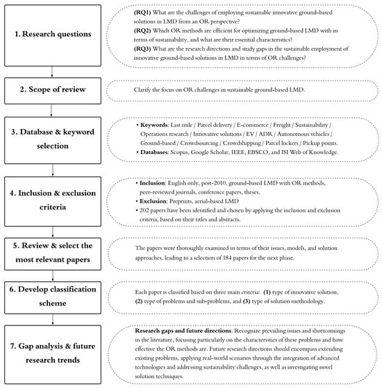 In Section 2, the methodology of this systematic review is explained in more detail. Section 3, Section 4, Section 5, Section 6, Section 7 and Section 8 describe the sustainable innovative solutions and introduce the challenges of using EV, ADR, PL, PP, CS, and FOT, respectively, in ground-based LMD from the OR perspective. Section 9 explains the combined innovative solutions in the literature from an OR perspective. Section 10 presents the comparative study, practical insights, and critical synthesis. In Section 11, the study gaps and future research directions are given. Finally, the concluding remarks are presented in Section 12.