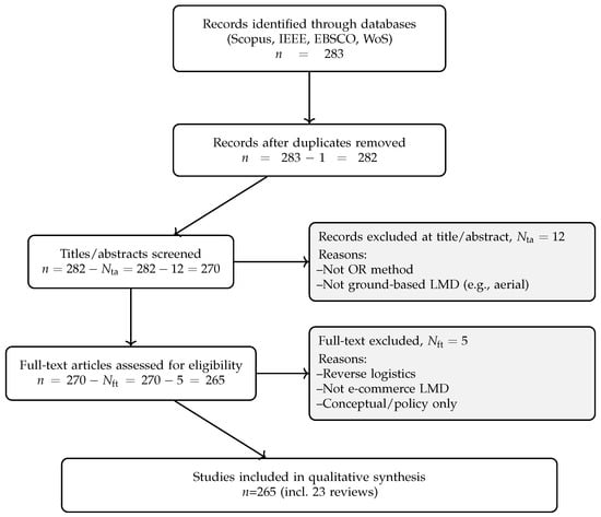 Methodological approach. We conduct a protocolled systematic review adapted from established guidance for operations and supply chain research. Searches covered Scopus, Google Scholar, IEEE Xplore, EBSCO, and Web of Science with pre-specified keywords (2010–2025; English; ground-based LMD; OR methods). We identified 283 records, screened titles/abstracts, assessed full texts against inclusion/exclusion criteria, and analyzed 265 eligible studies. A PRISMA-style flow diagram summarizes the identification, screening, eligibility, and inclusion processes. We then classify each study by innovation (EV, ADR, PL, PP, CS, FOT, hybrid), problem/sub-problem, and methodology, overlay the conceptual framework, and synthesize cross-cutting insights with comparative studies.
